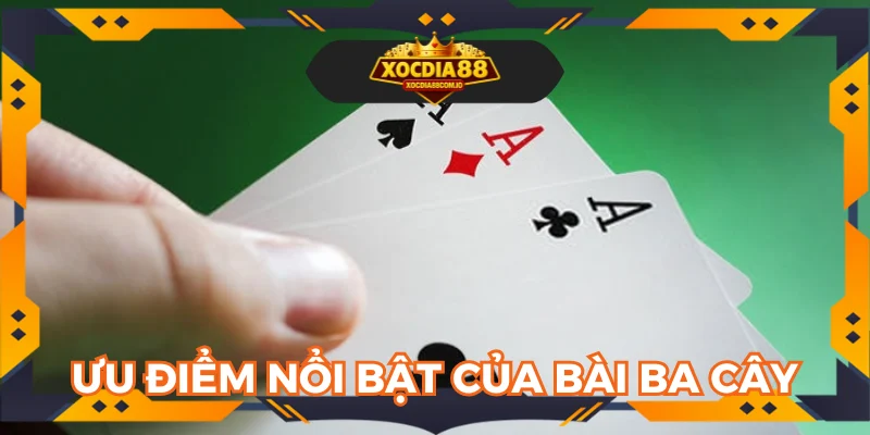 - Nhịp chơi nhanh, kịch tính: Khác với các game như poker, baccarat, bài ba cây không đòi hỏi chiến thuật hay thời gian suy nghĩ. Mỗi ván ba cây chỉ diễn ra trong khoảng 1 phút, thậm chí, đưa đến 1 phút. Chính sự nhanh gọn này khiến người chơi luôn cảm thấy hứng thú.